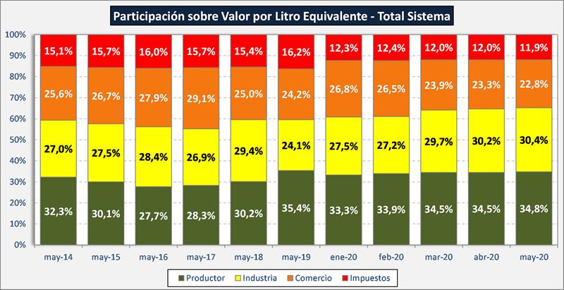 La participación del productor en el total del sistema fue para mayo del 2020 del 34,8%, 0,3 puntos por encima del mes anterior (máximo de la serie en junio de 2019 con el 36,0%) y bastante por encima de la media del 30,1%. Una leve mejora en la participación en los valores finales de mercado interno (0,4) y una baja de 0,6 puntos en el mercado externo. La participación del productor sobre el valor de salida de fábrica (precio al que vende la industria) fue de 53,3%, igual que el mes anterior, y 1,1 puntos por encima de la media de la serie disponible, cabe recordar que la serie histórica para salida de fábrica, es un año más extensa.