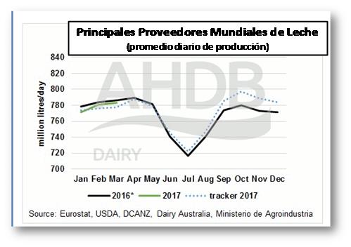 Según la AHDB, las entregas de marzo de estas Top-5 llegaron a la media de 783,4 millones de litros al día, acercándose a la cifra de 786 millones del mismo período del año 2016. La oferta de leche subió ligeramente debido fundamentalmente al buen crecimiento de las pasturas, en especial en Nueva Zelanda, promoviendo las entregas en marzo.