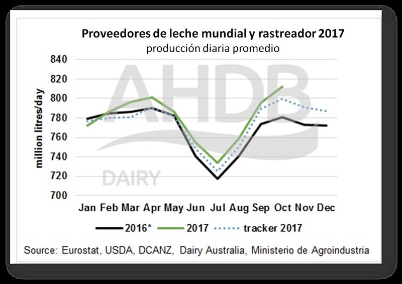 Las entregas de octubre promediaron 817 millones de litros por día, un aumento del 4,1% con respecto al año anterior, debido principalmente a una fuerte recuperación de la producción de leche en la UE-28 junto con el crecimiento estacional en Nueva Zelanda. Sin embargo, esto se debe a las comparaciones con un período en el que la producción de leche estaba cayendo, tanto debido a los precios débiles del año pasado, como al programa de reducción de la leche de la UE.