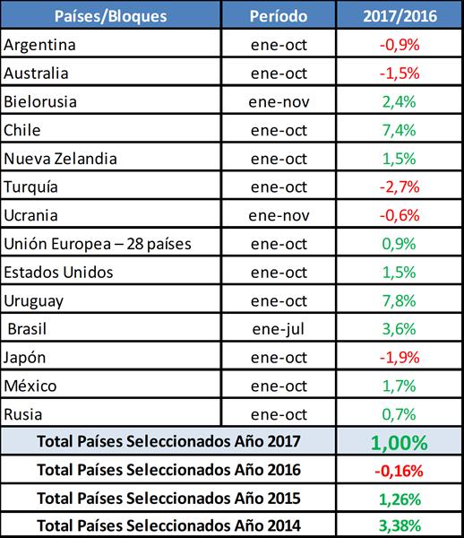 El cuadro anterior surge de tomar un grupo seleccionado de los principales países productores e importadores que representan algo más del 60% de la producción mundial de leche de vaca, se puede observar un crecimiento de la producción del 1%, ya cumplido prácticamente el 90% de año 2017. Cabe recordar que en nuestras publicaciones de los 3 meses anteriores la producción venía creciendo 0,31%, 0,48% y 0,80%, lo que indicaría que se podría cerrar el año con una tasa del orden del 1,1% en 2017 respecto a 2016 (algo inferior a la tasa histórica 1970-2016 del 1,4% anual).