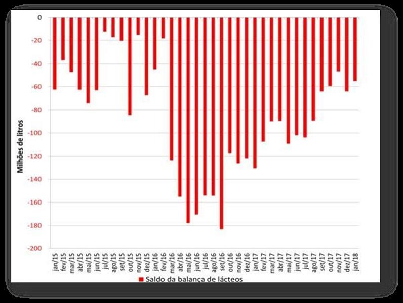 Los gastos de Brasil en importación de leche fueron 48% menores en relación a enero/2017, cerrando en casi 30,6 millones de dólares. Sin embargo, la leche en enero/2018 tuvo un costo aproximado de 0,47/litro, mientras que la misma leche hace 12 meses poseía un costo de 0,39/litro - una de las justificaciones para la reducción del volumen importado fue que los precios del mercado brasileño hoy están, en promedio, a 0,35/litro.