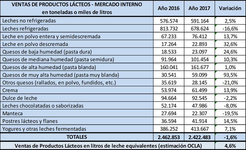 Las ventas registradas en 2017 en el mercado interno muestran un caída en volumen de productos del 1,6%, pero si al igual que con la elaboración, esos productos se convierten a litros de leche equivalente, el resultado se revierte a un incremento del 4,6%.