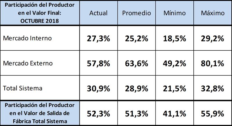 La participación del productor en la cadena se ve reflejada en el cuadro siguiente: