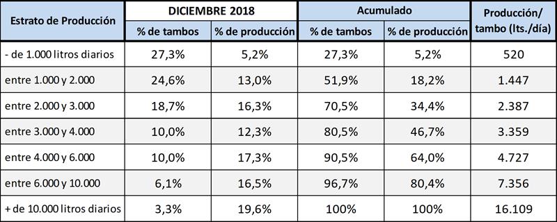 Puede observarse que los tambos de menos de 2.000 litros diarios de leche que representan el 51,9% de las unidades productivas, aportan el 18,2% de la leche total, y en el otro extremo los tambos de más de 10.000 litros diarios, que son sólo el 3,3% del total, aportan un volumen mayor de leche, el 19,6%. Los 357 tambos más grandes que producen un promedio de 16.110 litros diarios en promedio, aportan la misma cantidad de leche que 5.734 tambos que están en menos de 2.500 litros diarios (una media de 1.003 litros por tambo y por día).