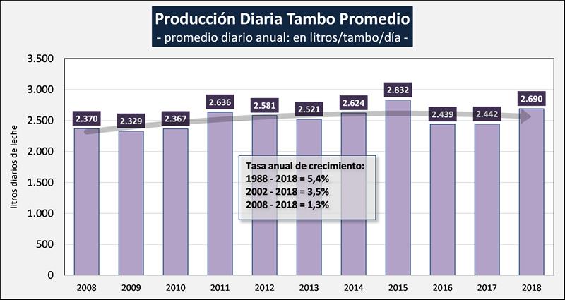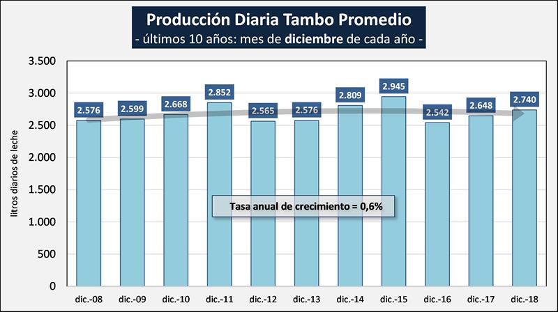 Sobre la base de la producción mensual y la cantidad anual de tambos, podemos inferir el tamaño del tambo promedio, unos 2.740 litros de leche diarios para diciembre de 2018, un 3,5% más que el año anterior (cabe acotar que la producción total interanual en diciembre, cayó un 2,1%). Si evaluamos su comportamiento en el tiempo, a pesar de la disminución en el número de unidades productivas y en el número de vacas, el tambo promedio presenta en el período 2008-2018 una tasa de crecimiento acumulada anual del 0,6%, lo que permite el sostenimiento de los niveles productivos agregados a nivel país.