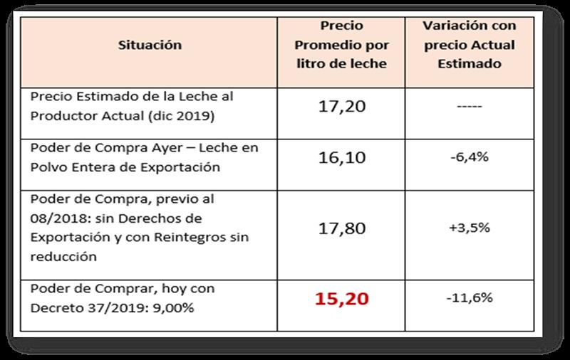 Las exportaciones representan en la actualidad alrededor del 18% del destino de la leche producida y aproximadamente el 24% de ellas corresponde en valor a leche en polvo entera en la presentación aquí calculada. El cuadro de doble entrada tiene por un lado los valores de costos de elaboración y comercialización, el tipo de cambio, el derecho de exportación, el reintegro de impuestos, un margen industrial, y la conversión de litros de leche a kilogramos de producto. Por otro lado el valor que se puede conseguir por el producto, en dólares por tonelada, dependiendo básicamente del destino y del volumen de la operación.
