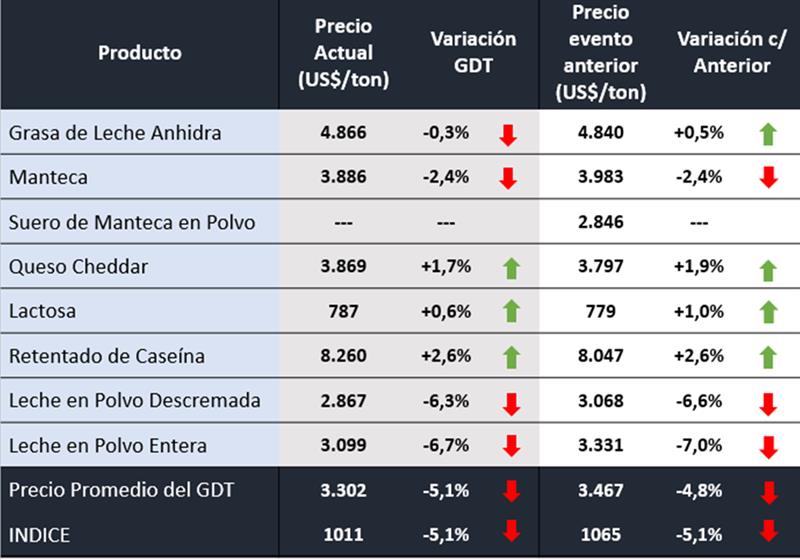 -GDT Price Index indica el promedio del cambio porcentual en los precios para cada especificación, ponderado por la cantidad de cada especificación vendida. GDT proporciona un cambio en el índice de precios de GDT del evento anterior para todos los productos, además de un equivalente para cada grupo de productos y cada combinación de grupo de productos/período de contrato. El índice de precios proporciona un reflejo más preciso de los movimientos de precios entre los eventos comerciales.
