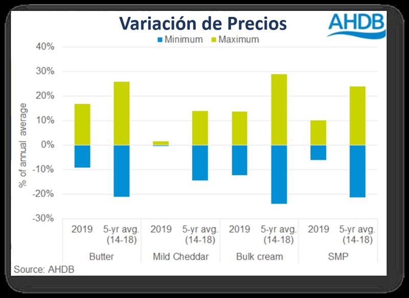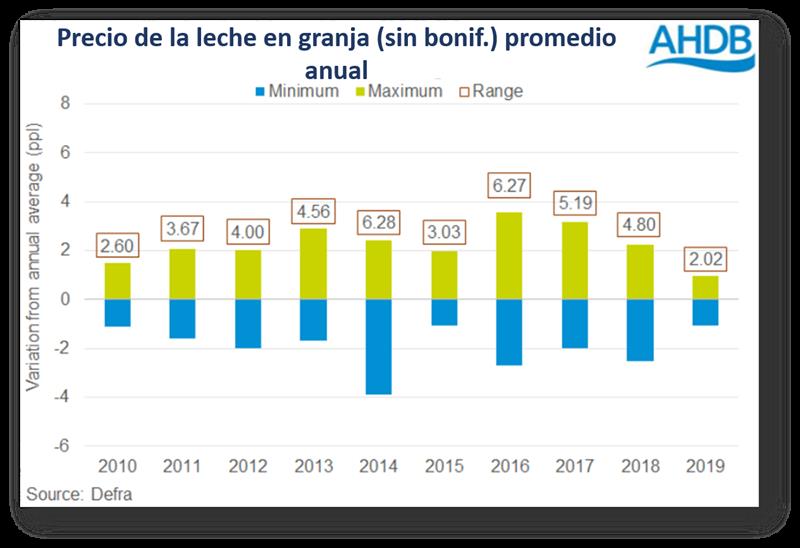 Los precios de las granjas en el Reino Unido se mantuvieron notablemente estables a lo largo de 2019, a pesar de un año de agitación comercial, volatilidad del tipo de cambio e incertidumbre del Brexit. Hasta 2019, el precio promedio mensual de la granja en el Reino Unido (excluyendo bonos) fluctuó entre 27,84 ppl y 29,85 ppl (unos 37 centavos de dólar por litro), un rango de solo 2,02 peniques. En comparación, los precios agrícolas tuvieron un rango entre 4,8-6,3ppl en los tres años anteriores. Esto destaca la relativa estabilidad del mercado en los últimos 12 meses, a pesar de las condiciones inciertas.