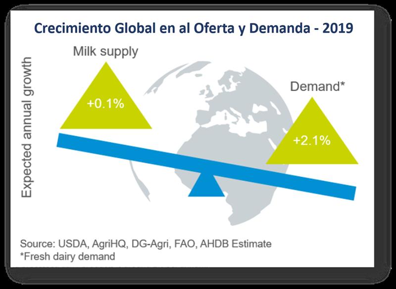 A nivel mundial en 2020, el crecimiento de la demanda continuará superando el crecimiento de los suministros, según nuestras estimaciones más recientes. Esto debería continuar brindando apoyo a los precios del mercado mayorista, y asumiendo que los precios del Reino Unido continúen rastreando los mercados mundiales, prestará apoyo a los precios de la leche de granja británica durante la primavera.