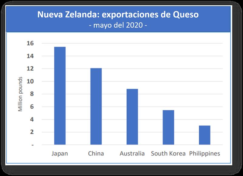 Además, China, normalmente el mercado de exportación de queso más grande de Nueva Zelanda, pasó al número dos en mayo, con Japón en el número uno. Las exportaciones de queso a Japón fueron de casi 15,5 millones de libras, más de 1 millón de libras desde mayo de 2019, pero no lo suficiente como para compensar la pérdida de ventas a China.