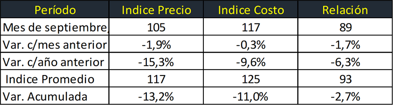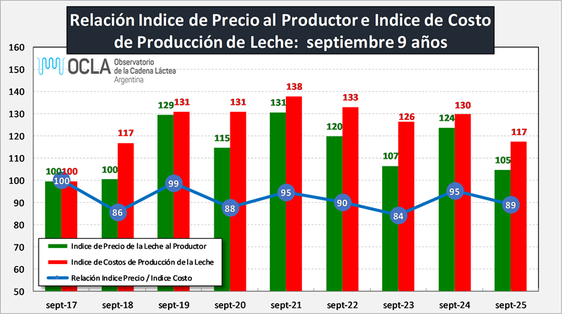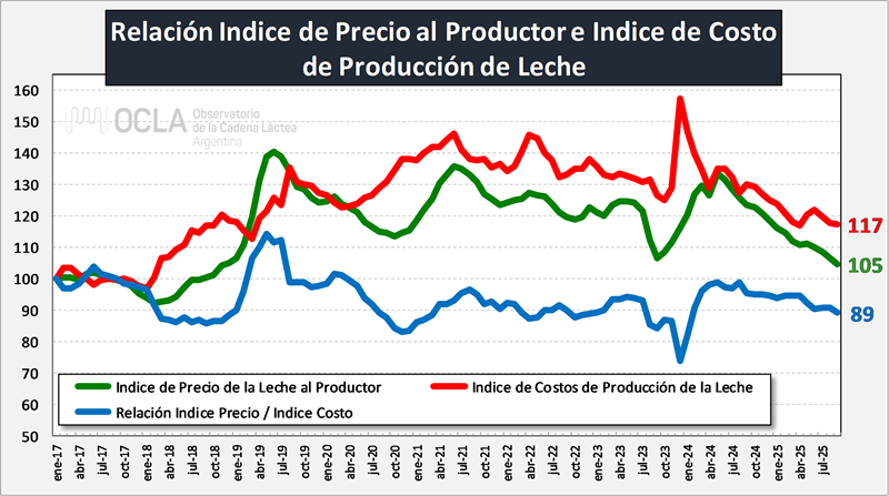 Cabe acotar que los precios de FAO promedian varias commodities de dos mercados muy representativos. Por su parte el Índice del GDT de Nueva Zelanda presentó mejoras de precios a partir de septiembre 2023 con algunos altibajos, pero continuando una significativa tendencia positiva que llega a su máximo en mayo de 2025 y luego comienza a caer con una leve recuperación en agosto próximo pasado, nueva caída en septiembre y octubre y precios futuros a la baja.