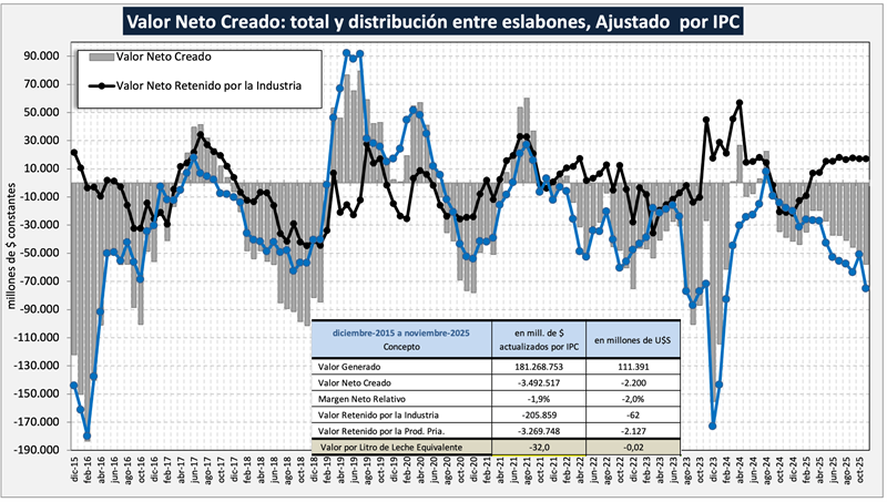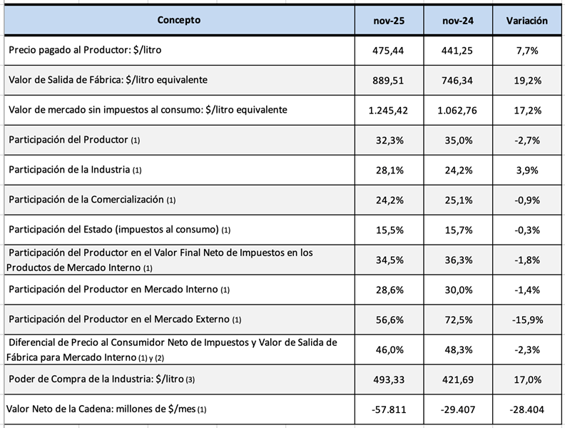 La cadena presenta un resultado negativo en noviembre de 2025 de $ 57.811 millones (4,0 centavos de dólar por litro de leche equivalente). El sector industrial tiene un resultado estimado positivo de $ 17.246 millones (US$ 12,1 M) y el sector primario tiene un resultado negativo de $ 75.057 millones. (- US$ 52,6 M).