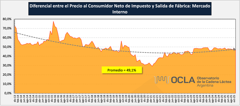 La participación del productor en el total del sistema fue para noviembre de 2025 del 32,3%, 0,4 puntos por encima del mes anterior, 2,7 puntos por debajo del año pasado y exactamente igual que la media del 32,3%. Los valores finales de mercado interno subieron 0,4 y los de mercado externo 0,3 puntos porcentuales, respecto al mes anterior. En el interanual baja 1,4 puntos en el mercado interno y 15,9 puntos en el externo. La participación del productor sobre el valor de salida de fábrica (precio al que vende la industria) fue de 53,4%, 0,2 puntos por debajo del mes anterior, 5,7 puntos por debajo del año anterior y 0,6 puntos por debajo del promedio de la serie (54,0%).