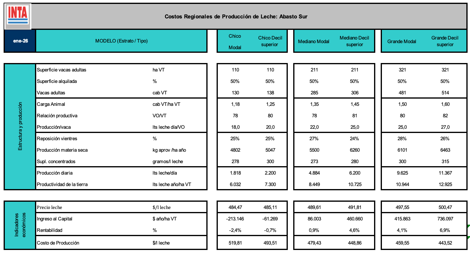 Los modelos se definen como representaciones simplificadas de la realidad. Partiendo de este concepto, en esta sección se presentan los costos de producción de leche asociados a modelos que reflejan a los sistemas productivos más frecuentes (modales) en las diferentes cuencas lecheras y para diferentes escalas de tamaño.Los mismos fueron construidos en talleres realizados con profesionales referentes de las diferentes regiones. Asimismo, se presentan los costos de producción de leche asociados a sistemas productivos reales del decil superior (10% superior en su resultado económico). En general, los costos presentan una alta dispersión respecto al valor modal,siendo sensibles a ciertas variables técnicas cuyas relaciones se presentan en los gráficos de correlación.
