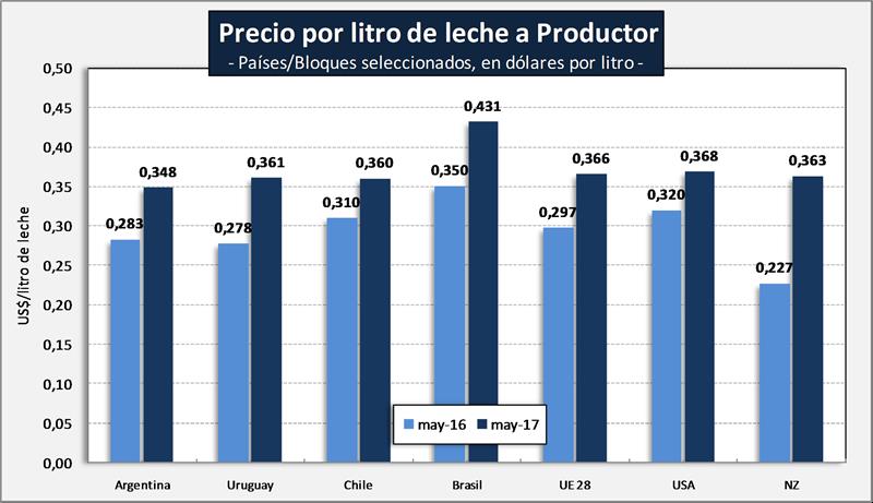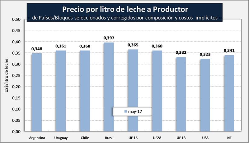 La idea de éste gráfico es suponer cuanto se pagaría la leche de Argentina en cada uno de los países sobre parámetros comparables de calidad composicional y sin considerar costos implícitos como es el caso de Brasil.