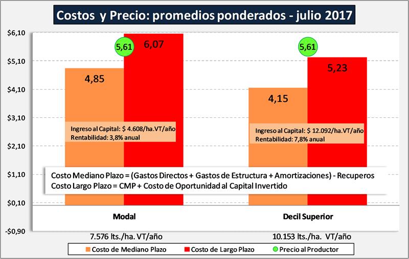Costos Regionales de Producción 16/8/2017Los modelos se definen como representaciones simplificadas de la realidad. Partiendo de este concepto, se elaboran los costos de producción de leche asociados a modelos que reflejan a los sistemas productivos más frecuentes (modales) en las diferentes cuencas lecheras (9 cuencas) y para diferentes escalas de tamaño (chico, mediano y grande). Los mismos fueron construidos en talleres realizados con profesionales referentes de las diferentes regiones. Asimismo, se presentan los costos de producción de leche asociados a sistemas productivos reales del decil superior (10% superior en su resultado económico). En general, los costos presentan una alta dispersión respecto al valor modal, siendo sensibles a ciertas variables técnicas cuyas relaciones se presentan en los gráficos de correlación. Los criterios metodológicos pueden verse en el documento: "Costos Regionales de Producción - INTA", Proyecto: "Sustentabilidad de los Sistemas de Producción de Leche". Para simplificar el análisis se calcula el promedio ponderado de todas las regiones y de todos los estratos productivos del tambo modal (sistema productivo más frecuente) y del decil superior (10% superior en sus resultados económicos), que se presentan en el gráfico siguiente. Ambos costos se comparan a nivel de mediano y largo plazo con el precio promedio pagado al productor informado por la industria en el mes respectivo. Cabe acotar que la comparación entre el costo promedio y el decíl superior, tiene el objetivo de plantear las posibilidades de mejora en los costos y por ende en los resultados económicos ante mejoras en los diferentes aspectos productivos y de manejo empresarial. ![]() El promedio ponderado de costos surge de calcular el ponderado de cada región en función a la participación relativa de cada uno de los estratos (chico, mediano y grande) en la producción regional y luego con todos los costos promedios regionales se calcula un ponderado sobre la participación de cada región en la producción nacional. – elaborado por el OCLA en base a Costos Regionales de Producción - INTA