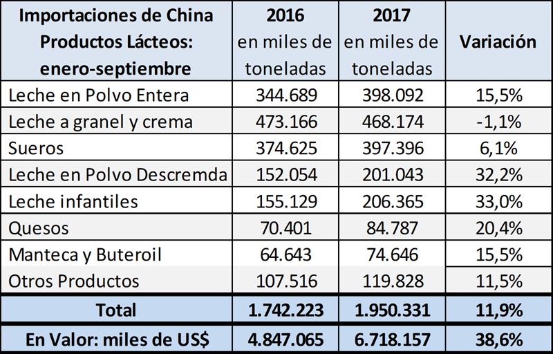 De enero a septiembre de 2017, las importaciones chinas de productos lácteos aumentaron en un 11,9% y un 34,1% en volumen en septiembre, solo después del 28,7% registrado en agosto.