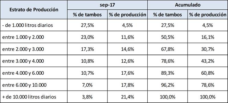 · Los 417 tambos del estrato superior (más de 10.000 litros), producen igual cantidad de litros que 6.250 tambos de los estratos menores (3.029 tambos de menos de 1.000 litros, 2.528 que producen entre 1.000 y 2.000 litros, y 693 tambos que producen entre 2.000 y 3.000 litros diarios).