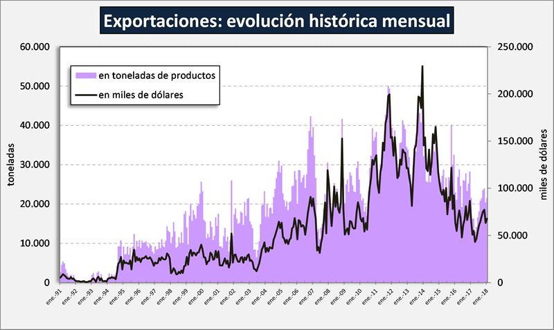 Evolución mensual de las exportaciones: en toneladas y en miles de dólares