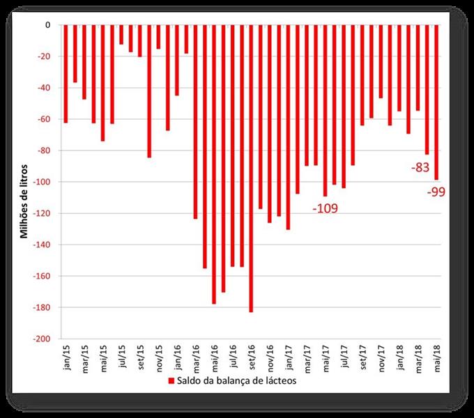 Al mismo tiempo, las exportaciones cayeron un 56% en relación al volumen exportado en abril y casi el 70% en relación a mayo de 2017. Así, el saldo de la balanza en equivalente de leche fue de 99 millones de litros de leche en mayo, 19 % peor que en abril.