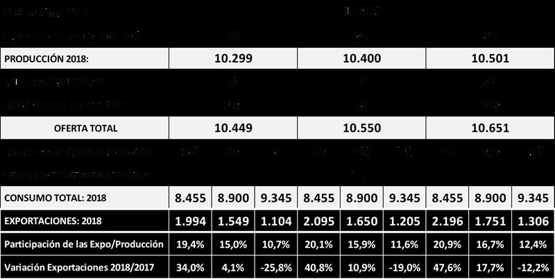Se Consideraron para el análisis, niveles similares a los años anteriores en cuanto a importaciones y diferencias de inventario (stock inicial – stock final), y 3 alternativas de consumo per cápita anual (190, 200 y 210 litros), cabe recordar que el consumo en los últimos tres años se movió entre los 217 y 197 litros, con lo que se puede obtener, 9 diferentes posibilidades de volúmenes exportables.