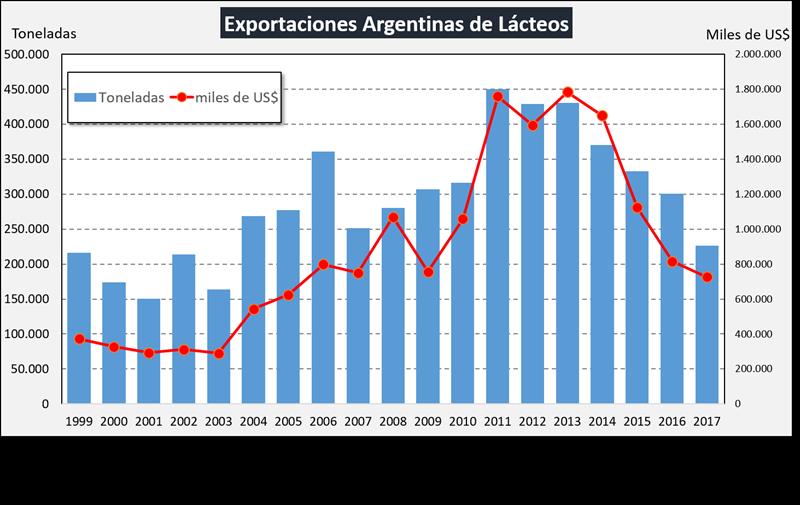 En 2017 se exportaron 226 mil toneladas de productos lácteos por un valor de US$ 727 millones y que se traducen en 1.488 millones de litros equivalentes (litros de leche cruda necesarios para elaborar esas 226 mil toneladas de productos). Ese volumen de litros exportados, representó el 14,7% del destino total de la leche producida.
