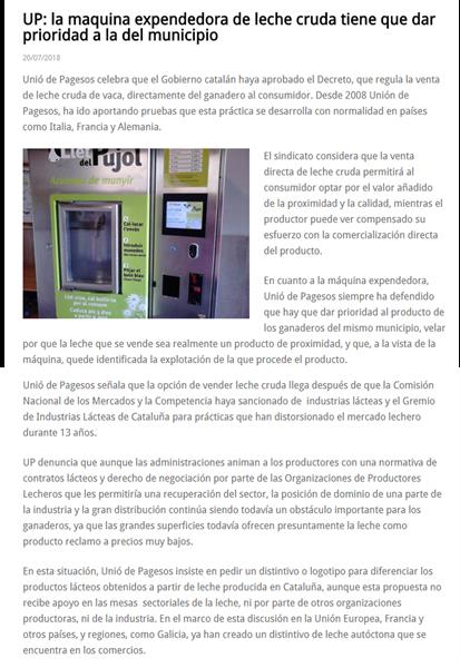 UP: la máquina expendedora de leche cruda tiene que dar prioridad a la del municipio 20/7/2018Artículo vinculado al publicado el día 18/07/18: Cataluña aprueba el Decreto de venta de leche cruda de vaca. ![]() Agrodigital