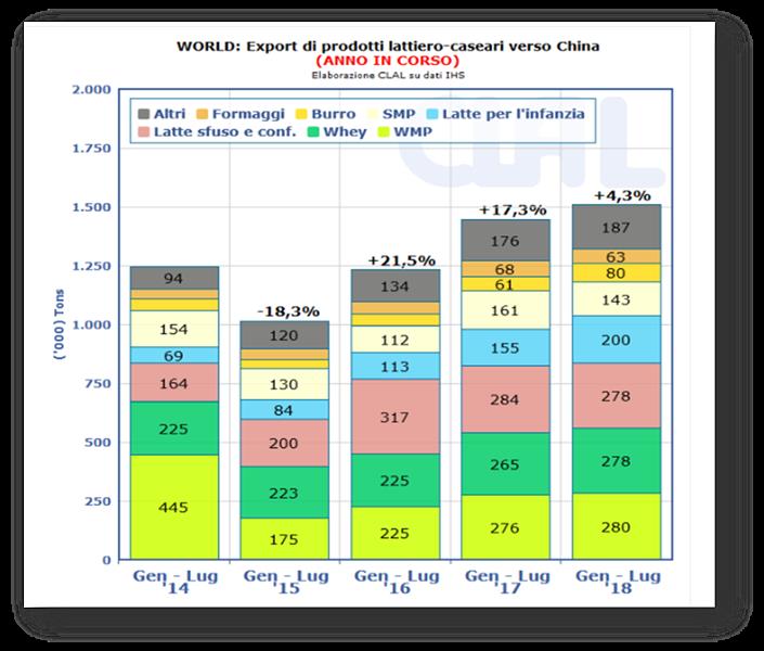 Las exportaciones mundiales de productos lácteos a China se desaceleran. En el periodo desde enero hasta julio de 2018, la exportación total creció por + 4,3% en comparación con el mismo período de 2017, pero el ritmo es menor cuando se compara con los primeros siete meses de 2016 (+ 21,5%) y 2017 (+ 17.3%).
