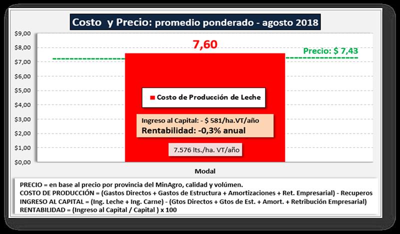 Si suponemos un tasa de rentabilidad exigida al capital del 5%, se debería genera un Ingreso Neto de $ 10.718/ha./año ($ 142.907 mensuales sobre la superficie considerada), que dividido por los 7.576 litros de leche de productividad promedio, deberían generar un ingreso neto unitario de $ 1,41/litro de leche. Por lo tanto el Precio de Equilibrio sería en este supuesto de $ 9,01/litro de leche ($ 7,60 de Costo Total + $ 1,41 de Rentabilidad al Capital), unos US$ 0,30/litro.