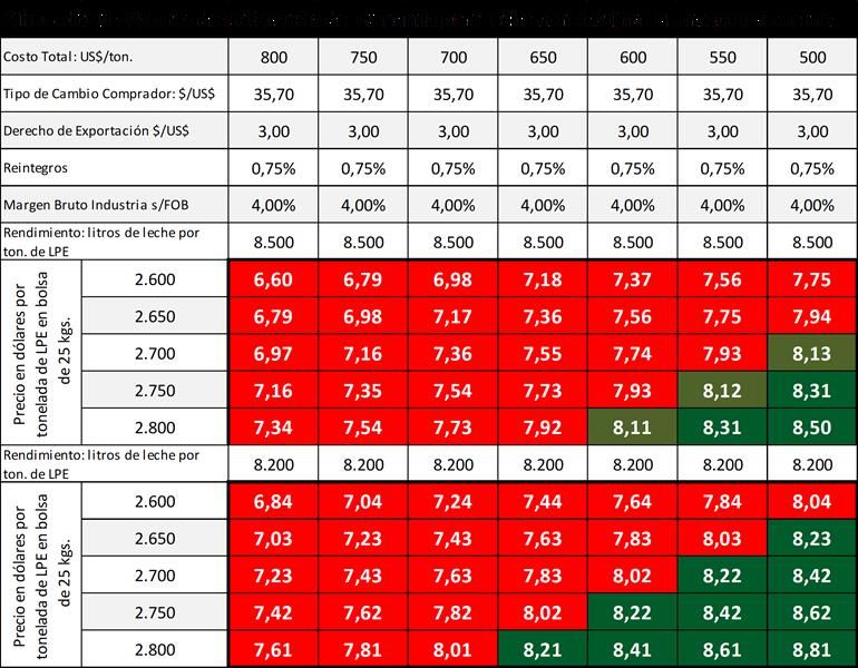El cuadro de doble entrada tiene por un lado los valores de costos de elaboración y comercialización, el tipo de cambio, el derecho de exportación, el reintegro de impuestos, un margen industrial y la conversión de litros de leche a kilogramos de producto. Por otro lado el valor que se puede conseguir para la leche entera en polvo en bolsas de 25 kgs., en dólares por tonelada.