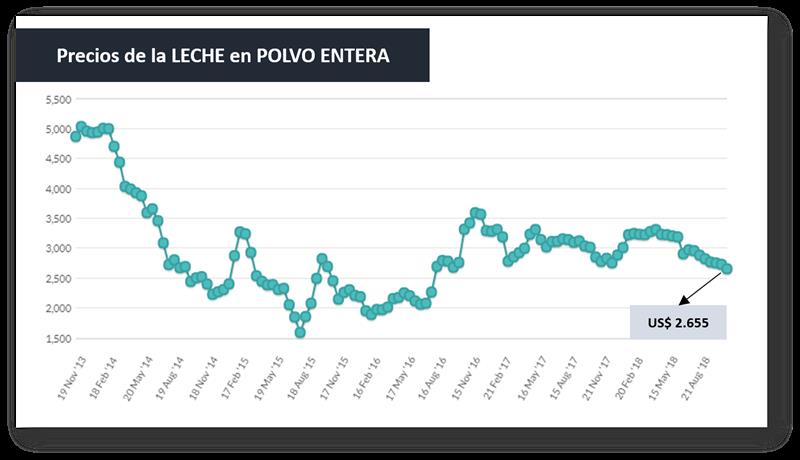 El Precio Promedio presentó una caída del 2,0%. La Leche en Polvo Entera (US$ 2.655) que tocó el valor más bajo de los últimos dos años (02/08/16 = US$ 2.265), tuvo una caída respecto al evento anterior del 2,9% y un descenso interanual del 6,9%. Hace apenas 6 meses (17/04/18) la LPE tenía una cotización de US$ 3.311/ton., lo que implica una caída en este breve lapso del 19,8%.