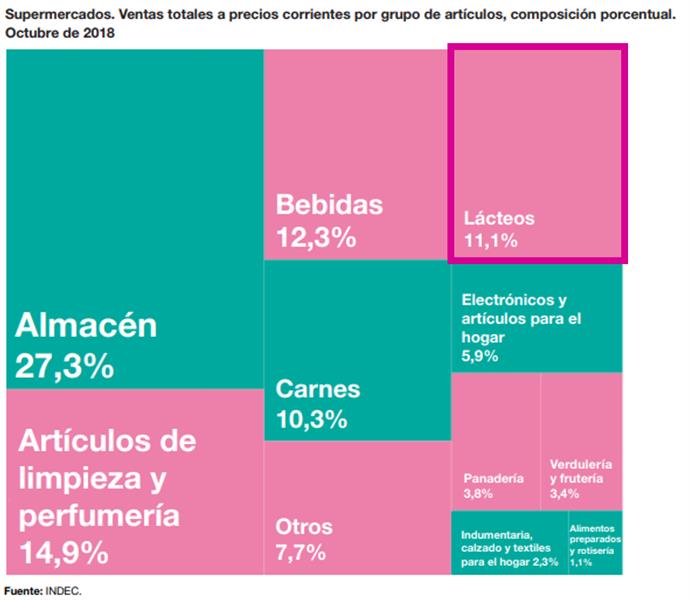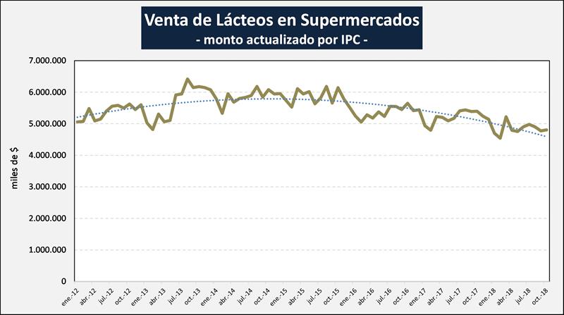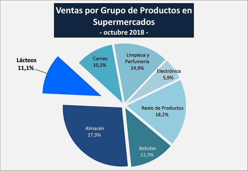 Respecto a la venta de lácteos en los supermercados según los datos de INDEC, fueron de $ 4.803,8 millones para el mes de octubre de 2018, lo que representa un incremento del 6,1% respecto al mes anterior y un 29,9% más que octubre de 2017.