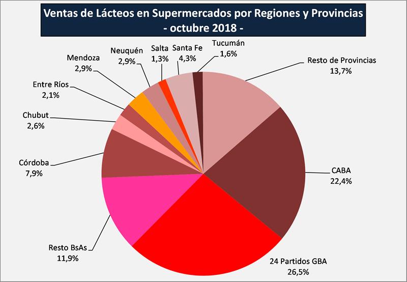 La distribución de esas ventas en el territorio nacional se visualiza en el gráfico siguiente, donde es de remarcar que la provincia de Buenos Aires representa el 60,8% de las ventas de lácteos en supermercados de todo el país.