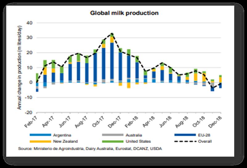 La producción de leche de las cinco regiones exportadoras clave de la UE-28, Argentina, Australia, Nueva Zelanda y los Estados Unidos se informa aquí para monitorear las tendencias en el suministro de leche.