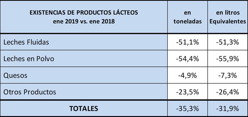 Como puede observarse en el cuadro, en enero de 2019 las existencias de productos lácteos se redujeron interanualmente un 35,3% en productos y un 31,9% en litros de leche equivalentes (litros de leche cruda necesarios para producirlos).