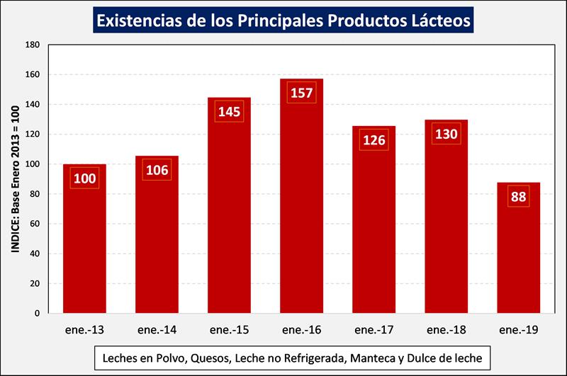 En el gráfico siguiente se toman las existencias de los principales productos lácteos, se las pondera por la participación de mercado y se las estandariza por litros equivalentes (para los que corresponde) y se calcula el índice para cada año, considerando a enero de 2013 = 100.