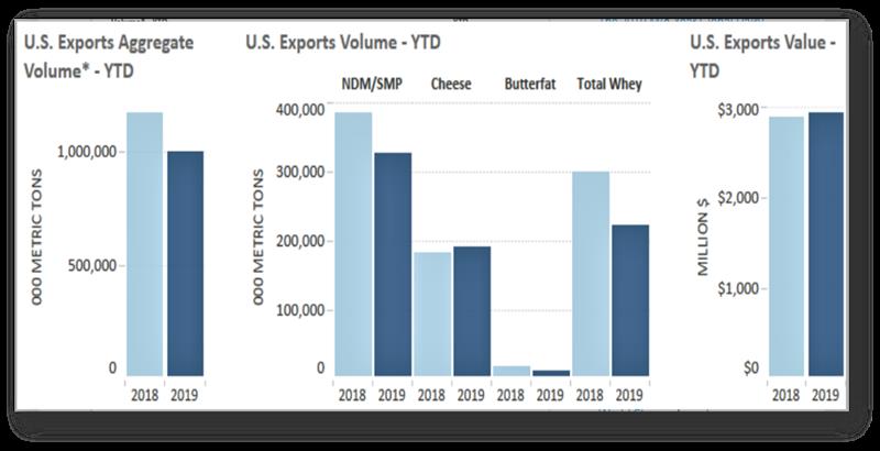 La pérdida de ventas a China debido a los aranceles de represalia y la peste porcina africana, además de la fuerte competencia en otros lugares de los proveedores europeos y neozelandeses, dieron como resultado un menor volumen de exportaciones de EE. UU. en el primer semestre de 2019. Envíos de leche en polvo, queso, grasa, productos de suero y lactosa fueron 1,0 millones de toneladas, un 14% menos que el ritmo récord del año pasado. Las exportaciones de estos productos principales a China disminuyeron un 54%, mientras que las ventas a otros mercados aumentaron un 5%.