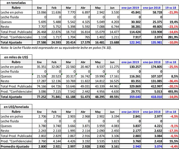 Exportaciones de Productos Lácteos hasta junio de 2019 16/8/2019