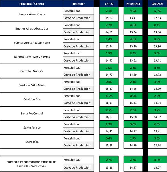 Cuando se analiza cada región y cada estrato pueden observarse diferentes realidades referidas a los niveles de productividad y eficiencia, y aunque tamaño no es sinónimo de eficiencia, los tambos de los estratos más grandes son los que generalmente presentan menores costos, mejores precios y mayores tasas de rentabilidad.
