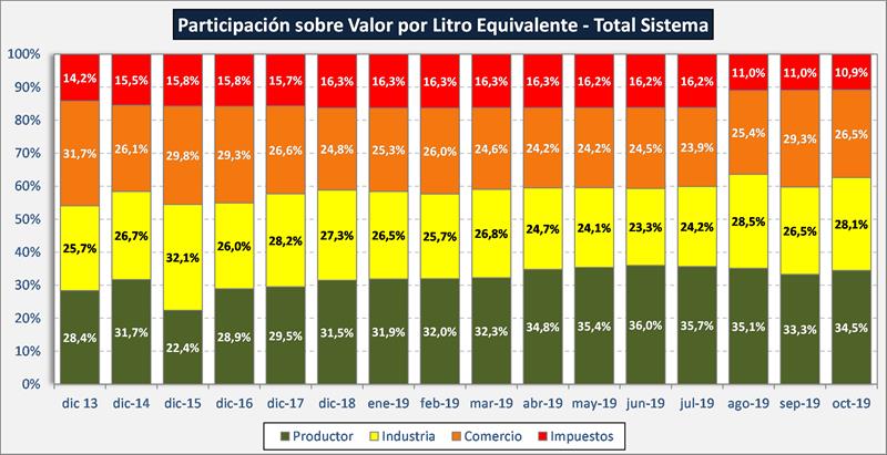 La participación del productor en el total del sistema fue para octubre del 34,5%, superior al mes anterior (máximo de la serie en junio de 2019 con el 36,0%) y bastante por encima de la media históricas del 29,7%. Una situación similar se da para la participación en los valores finales de mercado interno. La participación sobre el valor de salida de fábrica (precio al que vende la industria) fue de 55,1%, algo menor al mes anterior, pero más de 3 puntos por encima de la media histórica, cabe recordar que la serie histórica para salida de fábrica es un año más extensa que las otras.