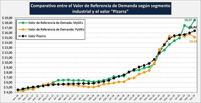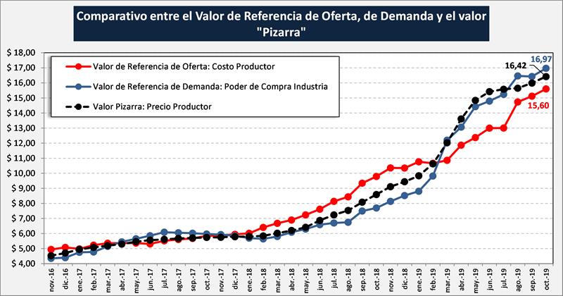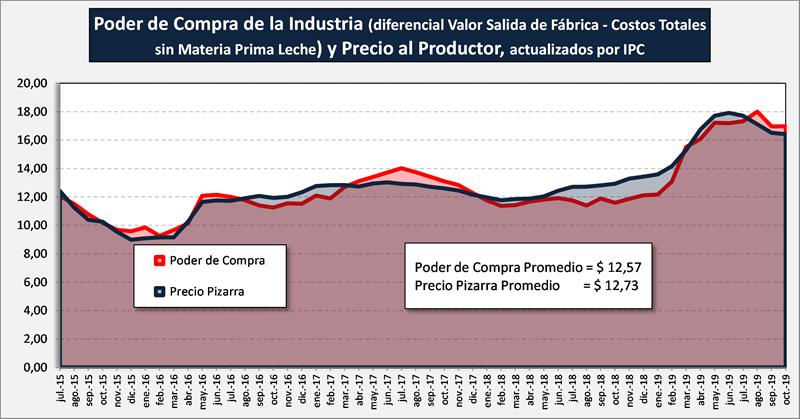 Valores de Referencia de Mercado – Poder de Compra de la Industria 29/11/2019Valores de Referencia · Valor de Referencia de Oferta: expresa la necesidad de ingreso por litro de leche del sector de producción primaria (gastos directos + gastos de estructura + amortizaciones + una tasa de interés al capital). · Valor de Referencia de Demanda: expresa la capacidad de pago por litro de leche cruda por parte de las industrias lácteas, en condiciones normales de operación y sin margen de renta alguno por encima del costo de oportunidad al capital incluido. · Valor Pizarra: precio publicado por la DNL-MAGyP en base a la muestra de 18 empresas. En el siguiente gráfico se comparan estas tres variables como promedio de todas las industrias: ![]() En el mes de octubre de 2019 la capacidad de pago según IAPUCo llega a $ 16,97/litro de leche y supera por tercer mes consecutivo al precio real pagado que fue para ese mes de $ 16,42. Si observamos el comportamiento del Valor por Litro Equivalente de Salida de Fábrica (precio al que vende la industria), se incrementó en 3,9% y el precio al Productor lo hizo en un 2,7%, aumentando la diferencia ocurrida en el mes anterior. En el gráfico de abajo se subdivide la capacidad de pago o valor de referencia de demanda, entre Megas y Grandes Empresas (MyGEs) y Pequeñas y Medianas Empresas (PyMEs). Cabe acotar dos cosas, la primera es que la capacidad de pago calculada es sobre la base del cumplimiento total de las obligaciones impositivas, y en segundo lugar que como ya lo hemos marcado, el precio real pagado, independientemente de la capacidad de pago de cada tipo de empresa, surge por las fuerzas que se dan en el mercado. Se observa en el gráfico una mayor capacidad de pago del segmento de MyGEs ($ 18,57/litro) y un valor para el segmento PyMEs de $ 15,13, incluso por debajo por tercer mes consecutivo, que el precio del Panel de 18 Empresas que para septiembre fue de $ 16,42. ![]() Viendo la capacidad de pago promedio de la industria, actualizada por IPC y comparada con el precio pizarra, para un período más largo, puede observarse que en el largo plazo (salvo oscilaciones temporales) los valores promedio convergen ($ 12,57 por litro de Poder de Compra y $ 12,73 por litro de Precio Pizarra). ![]() elaborado por el OCLA con datos del Convenio INTA-IAPUCO