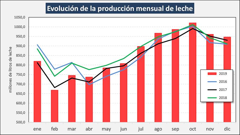 En el mes de diciembre de 2019 la producción fue de 946,6 millones de litros de leche, este valor representa una caída del 1,5% respecto al mes anterior (-4,7% en promedio diario) y un 4,0% más que igual mes del año anterior. El acumulado de los 12 meses de 2019, como se indicó más arriba, arrastra una caída del 1,75% respecto a 2018.