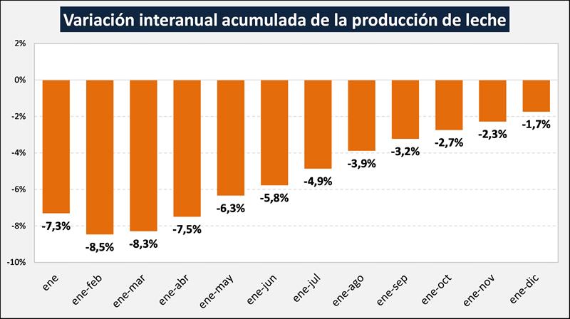 Si observamos el gráfico de abajo, podemos ver que la variación interanual acumulada de la producción de leche, a medida que transcurrieron los meses desde febrero, presentó paulatinamente una menor caída y que incluso a finales del año, superó al año anterior.