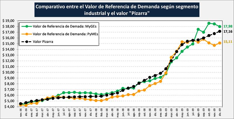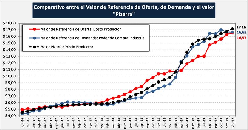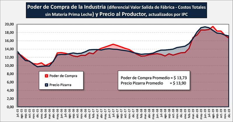 Valores de Referencia de Mercado – Poder de Compra de la Industria 22/1/2020Valores de Referencia · Valor de Referencia de Oferta: expresa la necesidad de ingreso por litro de leche del sector de producción primaria (gastos directos + gastos de estructura + amortizaciones + una tasa de interés al capital). · Valor de Referencia de Demanda: expresa la capacidad de pago por litro de leche cruda por parte de las industrias lácteas, en condiciones normales de operación y sin margen de renta alguno por encima del costo de oportunidad al capital incluido. · Valor Pizarra: precio publicado por la DNL-MAGyP en base a la muestra de 18 empresas. En el siguiente gráfico se comparan estas tres variables como promedio de todas las industrias: ![]() En el mes de diciembre de 2019 la capacidad de pago según IAPUCo llega a $ 16,65/litro de leche y es inferior al precio real pagado que fue para ese mes de $ 17,16 (Panel 18 Empresas). Si observamos el comportamiento del Valor por Litro Equivalente de Salida de Fábrica (precio al que vende la industria), se incrementó en 1,2% y el precio al Productor lo hizo en un 2,4%. En el gráfico de abajo se subdivide la capacidad de pago o valor de referencia de demanda, entre Megas y Grandes Empresas (MyGEs) y Pequeñas y Medianas Empresas (PyMEs). Cabe acotar dos cosas, la primera es que la capacidad de pago calculada es sobre la base del cumplimiento total de las obligaciones impositivas, y en segundo lugar que como ya lo hemos marcado, el precio real pagado, independientemente de la capacidad de pago de cada tipo de empresa, surge por las fuerzas que se dan en el mercado. Se observa en el gráfico una mayor capacidad de pago del segmento de MyGEs de $ 17,98/litro (dicho sea de paso, que cae por segundo mes consecutivo) y un valor para el segmento PyMEs bajísimo de $ 15,11, incluso debajo por quinto mes consecutivo, que el precio del Panel de 18 Empresas que para diciembre fue de $ 17,16 (ahora en la planilla de la DNL figura un precio de $ 17,14, IAPUCo tomó el dato que figuraba inicialmente de $ 17,16). En este año se dio una gran variabilidad entre capacidades de pago y precio real pagado. En el período de menor producción las industrias más grandes, pagaron por encima de su capacidad, luego al arribar al pico de producción la situación se revierte. Una situación inversa para las pymes que finalizan el año con una capacidad de pago absolutamente deteriorada, cuando tuvieron una situación no tan adversa en el primer semestre. ![]() Viendo la capacidad de pago promedio de la industria, actualizada por IPC y comparada con el precio pizarra, para un período más largo, puede observarse que en el largo plazo (salvo oscilaciones temporales) los valores promedio convergen: $ 13,73 por litro de Poder de Compra y $ 13,90 por litro de Precio Pizarra. ![]() elaborado por el OCLA con datos del Convenio INTA-IAPUCO