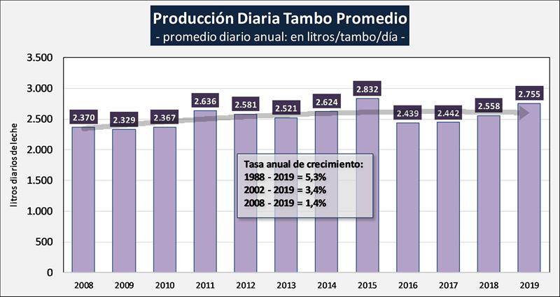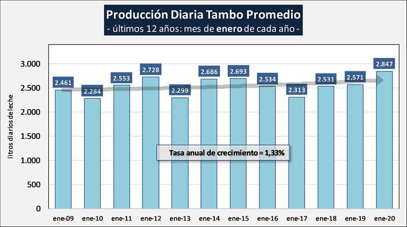 Estructura de la producción primaria – enero 2020 21/2/2020Estratificación de Tambos En el cuadro se presenta la participación de los tambos en función a su tamaño medido en litros de leche diarios del mes de enero de 2020 sobre la base SIGLeA: ![]() Puede observarse que los tambos de menos de 2.000 litros diarios de leche que representan el 55,8% de las unidades productivas, aportan el 19,8% de la leche total, y en el otro extremo los tambos de más de 10.000 litros diarios, que son sólo el 3,0% del total, generan un volumen de producción similar (19,5%). Es decir que los algo menos de 300 tambos estimados del estrato de + de 10.000 litros que producen un promedio de 18.668 litros diarios, aportan la misma cantidad de leche que los 5.450 tambos que producen menos de 2.000 litros diarios. El proceso de concentración de la producción en tambos más grandes es continuo y se ha acelerado en los últimos años, con tasas entre 2 y 4% anual, cuando veníamos de niveles de tasas de alrededor del 2% anual. Según la información que hemos publicado en OCLA en base al World Dairy Situation de la Federación Internacional de Lechería 2019 (FIL/IDF), muestran un tasa para los principales países lecheros del mundo algo por encima del 4% de reducción anual de tambos. El Tambo Promedio Mensual Sobre la base de la producción mensual y la cantidad anual de tambos (SENASA hasta 2019 y estimación propia para 2020), podemos inferir el tamaño del tambo promedio, unos 2.847 litros de leche diarios para enero de 2020, un 10,7% más que el año anterior (cabe acotar que la producción en enero de 2020, fue 5,5% superior a enero de 2019). Si evaluamos su comportamiento en el tiempo, a pesar de la disminución en el número de unidades productivas y en el número de vacas, el tambo promedio presenta en el período 2009-2020 una tasa de crecimiento acumulada anual del 1,33%, lo que permite, a pesar de la reducción en las unidades productivas y en el rodeo, el sostenimiento de los niveles productivos agregados a nivel país. ![]() La serie de cantidad de tambos (SENASA) utilizada para los cálculos de la producción por tambo, es la única disponible y a pesar de conocer algunas falencias en el relevamiento de la información, el criterio se mantiene en el tiempo y nos permite evaluar la tendencia. En caso de existir una fuente de información mejor, obviamente no proveniente de estimaciones o supuestos, la incorporaremos en nuestro análisis. El Tambo Promedio Anual ![]() elaborado por el OCLA sobre información de la DNL-MAGyP y SENASA