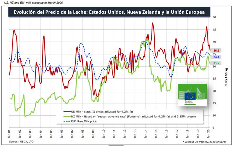 - Los precios de la leche en Nueva Zelanda volvieron a bajar ligeramente en marzo de 2020, a 31,2 centavos/kg, -8% desde principios de año.