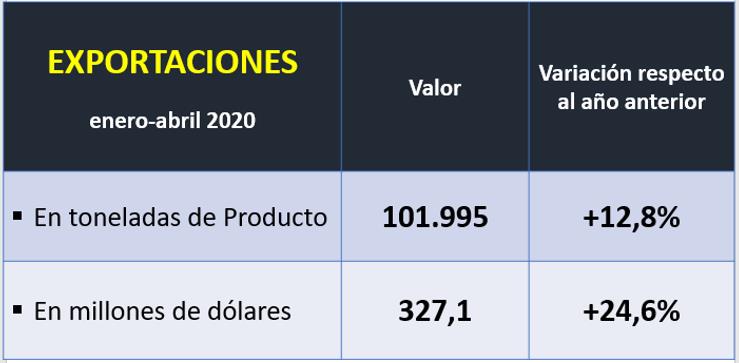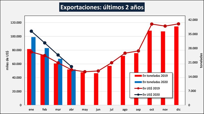 Las exportaciones del mes de abril del 2020, subieron un 0,5% en volumen de producto y 8,8% en monto total en dólares respecto al mismo mes del año 2019. Respecto al último mes del año anterior (diciembre 2019) donde alcanzaron el pico de ese año, las exportaciones vienen cayendo fuertemente llegando en abril último a estar -54,6% en volumen y -52,6% en valor. Como puede verse en el cuadro superior, el acumulado del 1° cuatrimestre es mayor en un 12,8% en volumen y 24,6% en valor, respecto a igual período del año anterior.