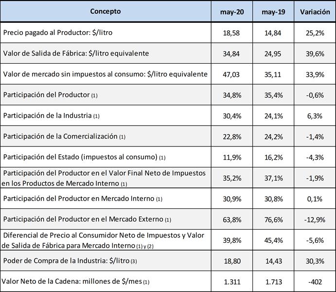 La facturación total de la cadena de valor lácteo, fue en el mes de mayo del 2020 de $ 49.654 millones es decir un -1,3% respecto al mes pasado en promedio diario, y 38,1% por encima de mayo del 2019, recordando que la inflación anual (IPC) fue del 43,4%.
