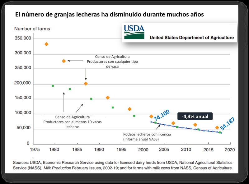 El número de rodeos lecheros con licencia disminuyó cada año entre 2002 y 2017, a una tasa anual promedio de 4,0%. Sin embargo, esa tasa de disminución se aceleró en 2018 y 2019. El número de rodeos con licencia disminuyó en 2.731 granjas solo en 2018, o 6,8% del total de 2017, y luego cayó otro 8,8% en 2019, ya que el total disminuyó en 3.281 granjas.