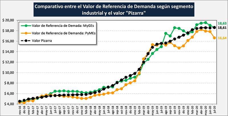 Se observa en el gráfico una mayor capacidad de pago en el mes de julio/20 del segmento de MyGEs de $ 18,63/litro ($ 0,02 por encima del precio pagado) y un valor para el segmento PyMEs de $ 16,64 ($ 1,99 por debajo del precio pagado), que está por décimo cuarto mes consecutivo por debajo del precio pizarra.